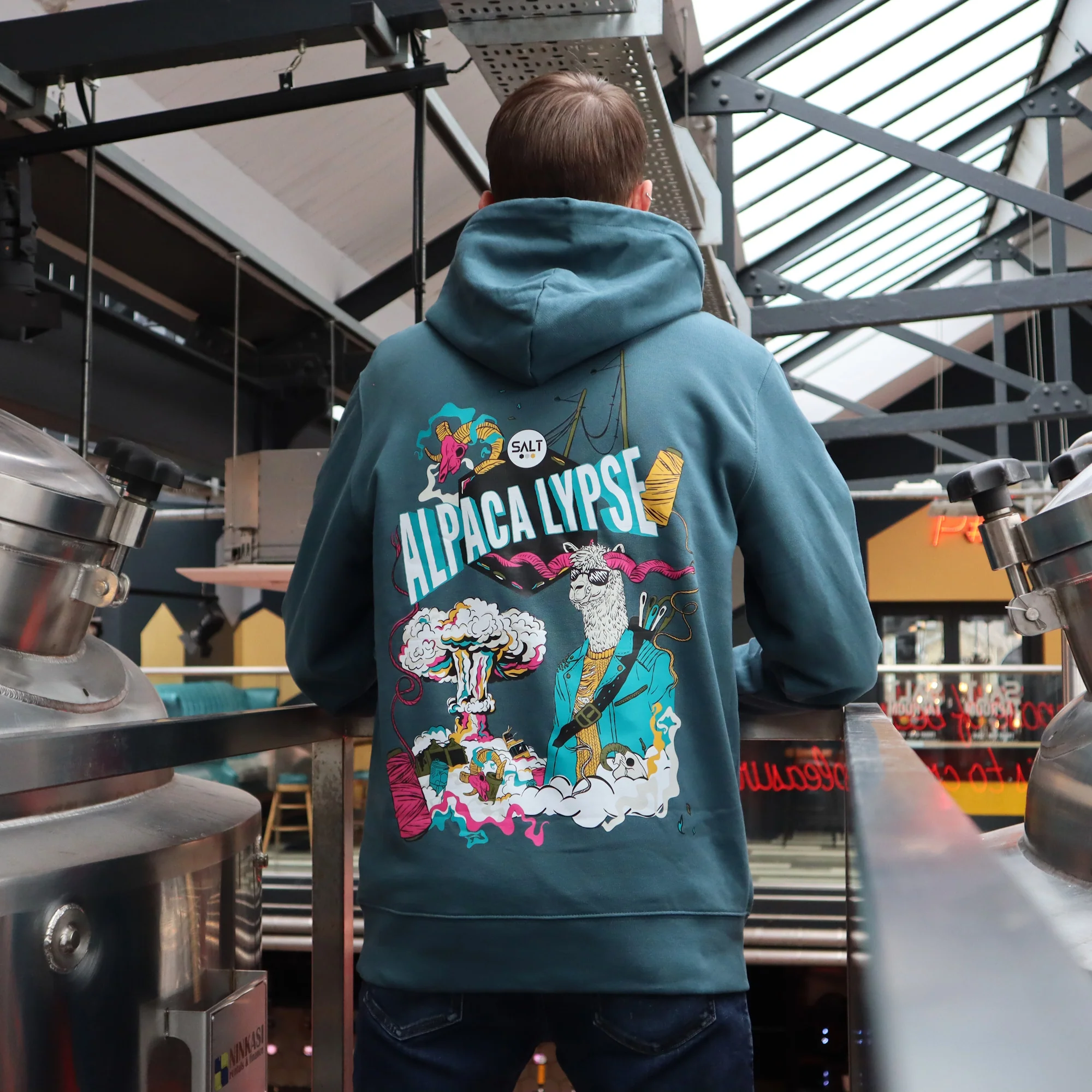 Join our team of 'Pacas and don the Alpacalypse hooded sweatshirt. Logo on the front, full Alpaca-lyptic design on the back.